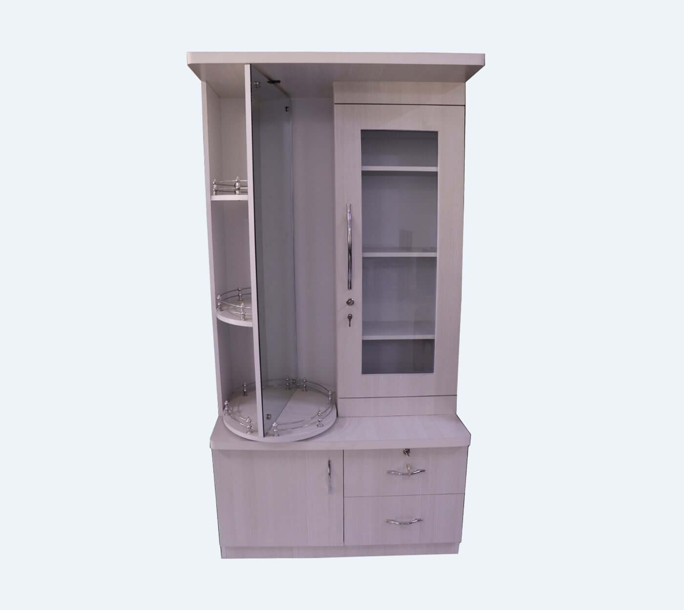 The MDF Particle Board Rounding Door Dressing Table is crafted from laminated particle board, offering durability and a sleek finish. It features rounded doors for a modern touch and comes with a lifetime warranty against termites. This dressing table is water-resistant and scratch-proof, ensuring long-lasting use and easy maintenance.